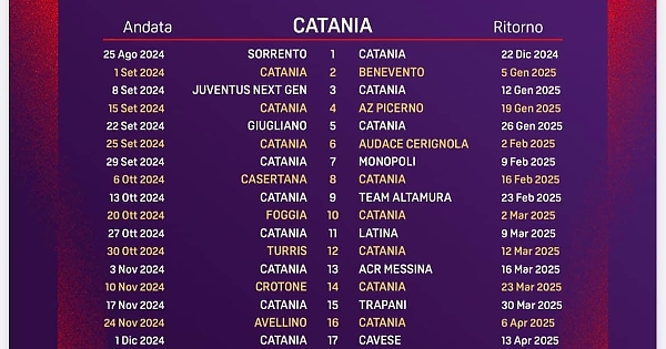 Varato il calendario della stagione 2024/25 della serie C. Per il Catania esordio in trasferta il 25 agosto contro il Sorrento. Per il Messina esordio casalingo contro il Potenza, mentre il neo promosso Trapani se la vedrà allo Zaccheria contro il Foggia. Quest'anno nel girone C quello meridionale c'è anche la Juventus NexGen che comincerà in casa contro il Cerignola.