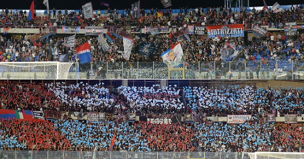 Quando le squadre fanno l’ingresso in campo i cinquemila palloncini colorati di rosso e di azzurro creano un colpo d’occhio di rara bellezza. C’è anche la scritta “Ucn”, Ultrà Curva Nord in bianco che campeggia nell’anello più alto del settore. Dalla Sud sventolano le bandiere. I due settori sono sold out da giorni, in tribuna B qualche vuoto, ma i gruppi che storicamente stanno lì riempiono gli spazi a furia di urla e incitamento. La Vip è stracolma, anche la A è piena zeppa.