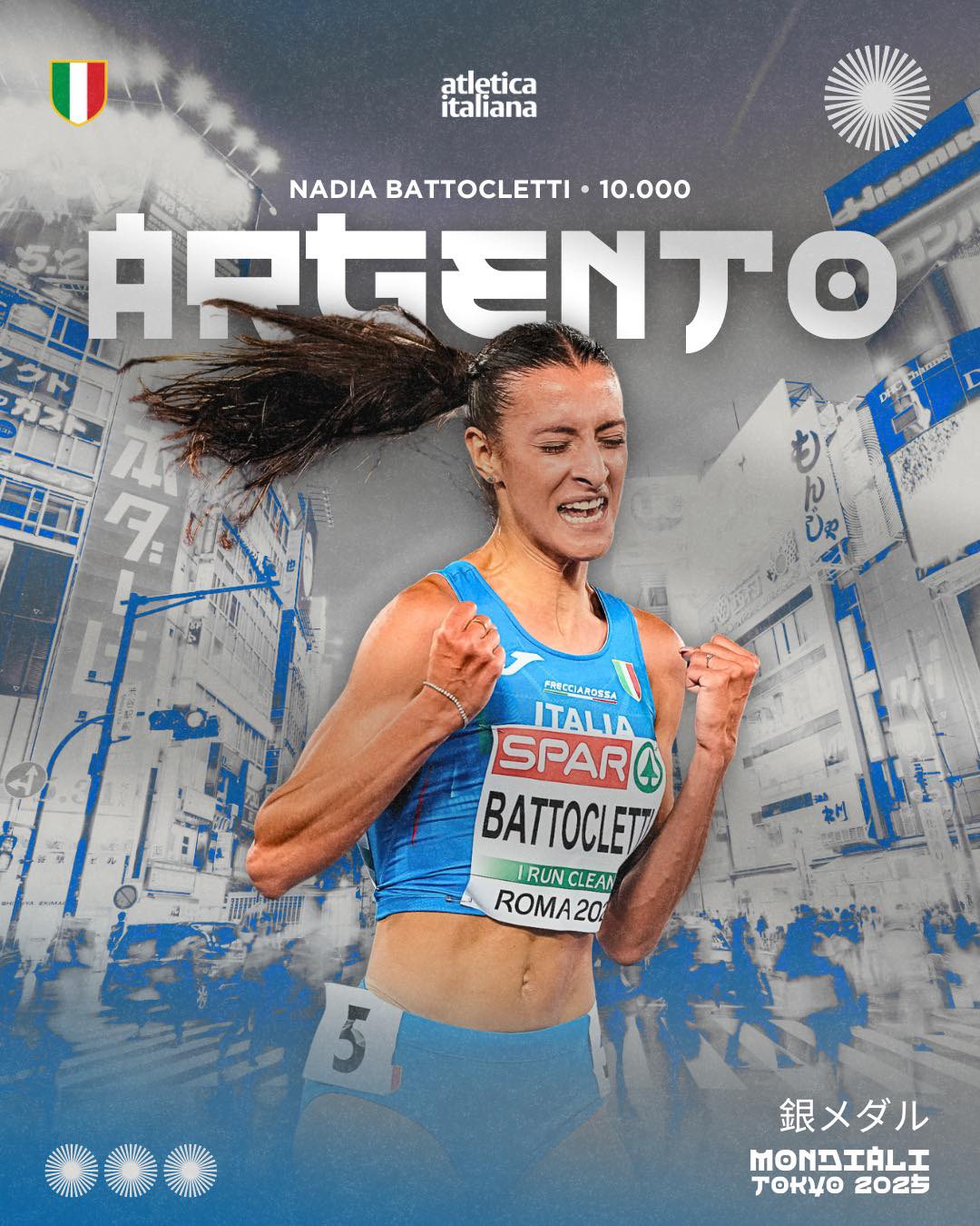 Prima giornata dei Mondiali di Tokyo da incorniciare per l'Italia dell'atletica. Dopo l'argento di Antonella Palmisano nella 35 km di marcia, sono arrivate altre due medaglie pregiate che portano la firma di Nadia Battocletti argento nella finale nei 10.000 e di Leonardo Fabbri bronzo nel peso e in chiusura l'ottimo settimo posto in finale della staffetta 4x400 mista con Luca Sito (al posto di Edoardo Scotti che aveva corso la batteria), Anna Polinari, Vladimir Aceti e la nissena Alice Mangione.