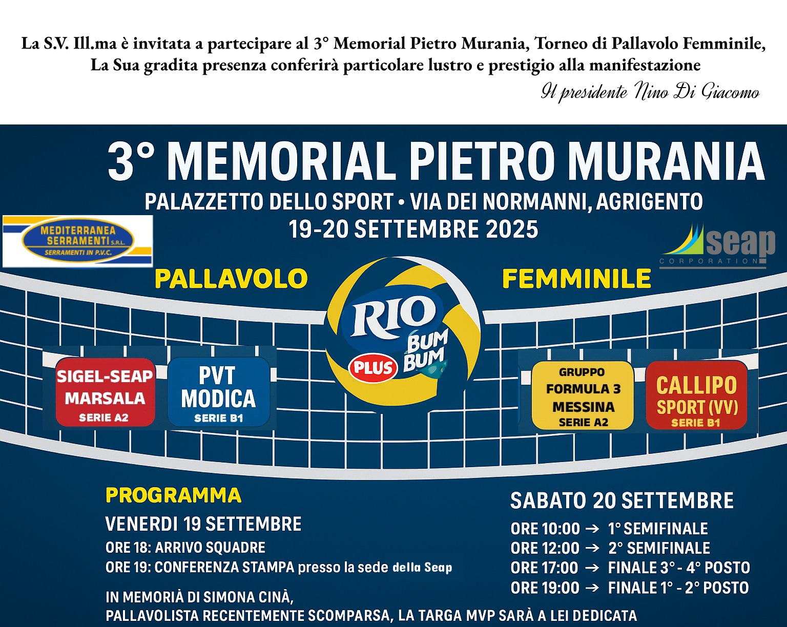 L'evento prenderà il via venerdì 19 settembre alle ore 18 con una conferenza stampa, ospitata presso la sede della SEAP nella zona industriale di Agrigento. Sarà un momento di condivisione e ricordo, alla presenza della signora Marina, moglie di Pietro Murania, dell’amministratore delegato della Kemeco Paolo Grifo e del responsabile marketing Antonio Gargano. Il cuore pulsante del torneo batterà sabato 20 settembre con un programma serrato ed emozionante: Ore 10:00, Prima Semifinale: Sigel Seap Marsala vs PVT Modica - Ore 12:00, Seconda Semifinale: Gruppo Formula 3 Messina vs Tonno Callipo Vibo Valentia - Ore 17:00, Finale 3°-4° posto - Ore 19:00, Grande Finale 1°-2° posto e cerimonia di premiazione.