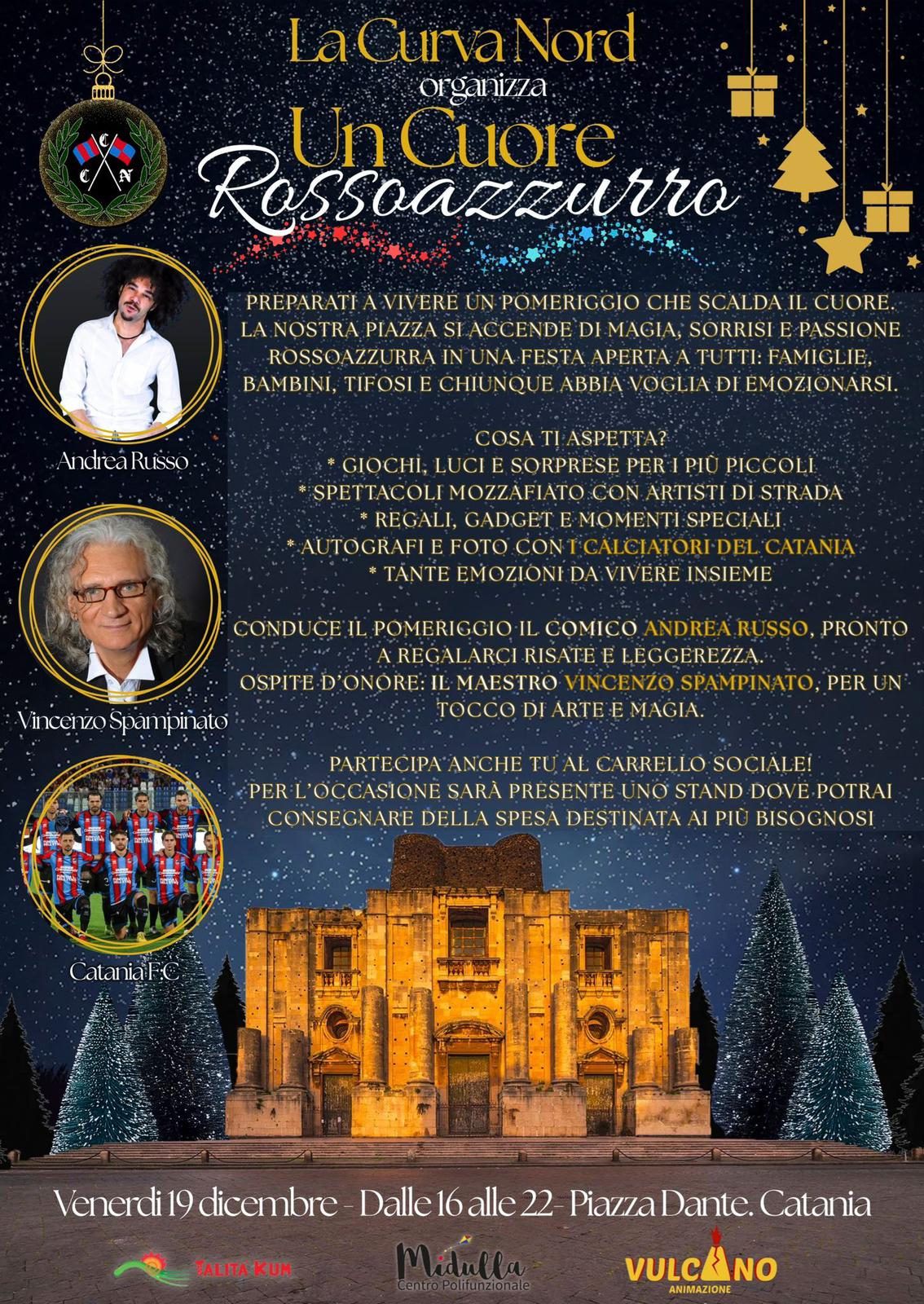 Due iniziative di enorme spessore sociale e solidale vedranno in prima linea gli ultrà della Curva Nord fedeli al Catania. Venerdì pomeriggio, e fino a tarda sera, nella sede storica di piazza Dante si terrà una serata intitolata “Cuore Rossazzurro”.