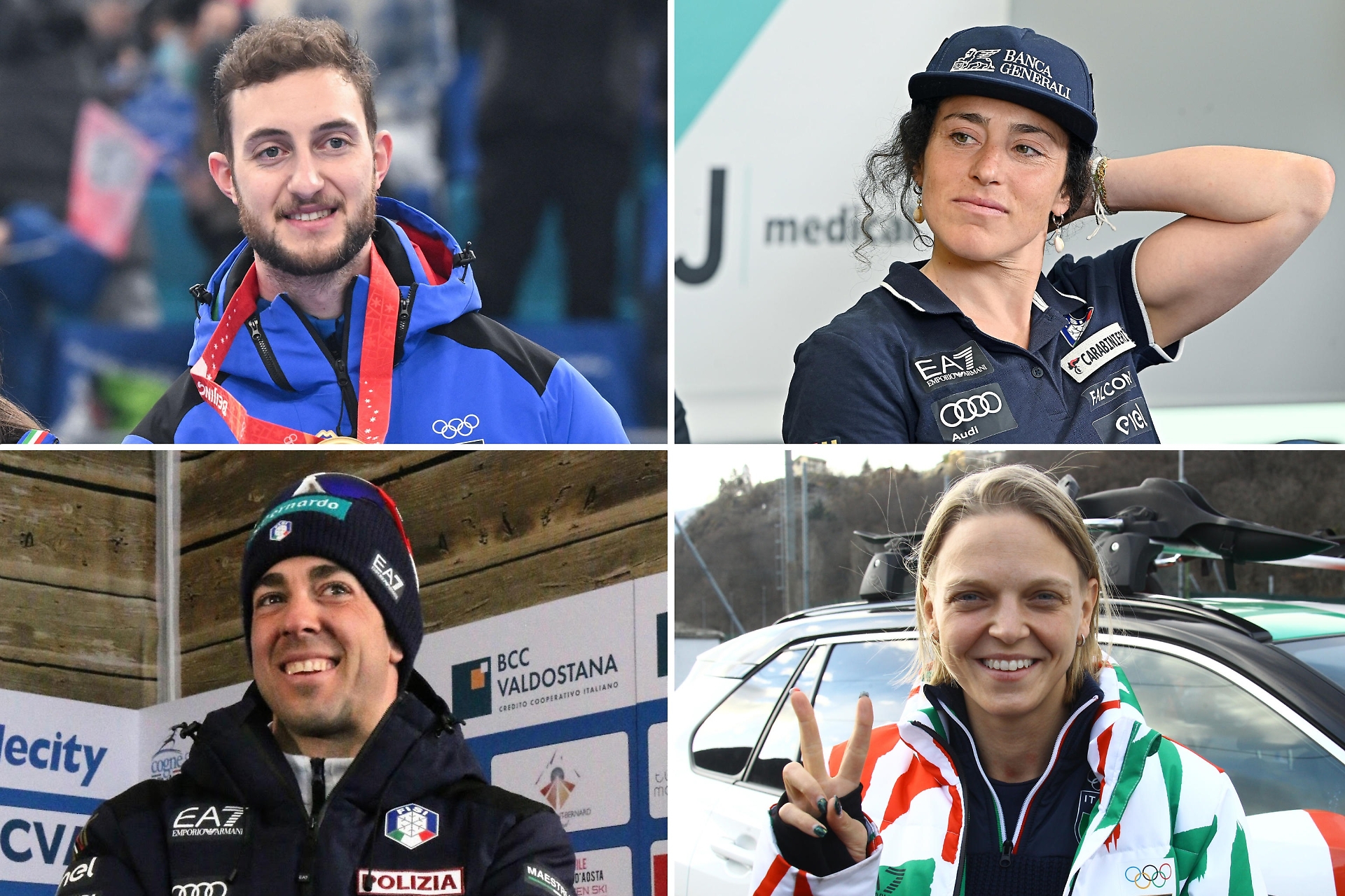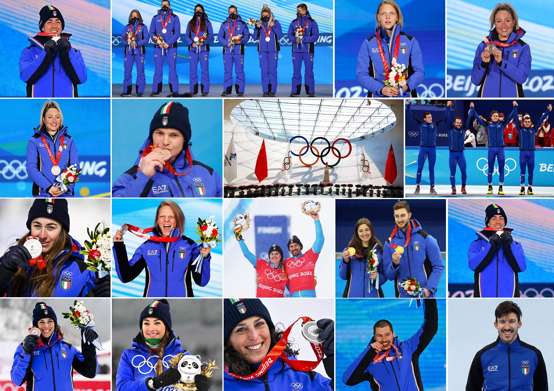 Le medaglie ai Giochi invernali di Pechino 2022. Prima fila, da sinistra: Federico Pellegrino, la squadra di Short trak, Arianna Fontana e Francesca Lollobrigida; Seconda fila, da sinistra: Francesca Lollobrigida, Dominik Pischnaller, la squadra dei 5.000m di Short trak; Terza fila, da sinistra: Sofia Goggia, Arianna Fontana, Michela Moioli con Omar Visintin, Stefania Constantini con Amos Mosaner e Federico Pellegrino; Quarta fila, da sinistra: Federica Brignone, Dorothea Wierer, Federica Brignone, Omar Visintin e Davide Ghiotto