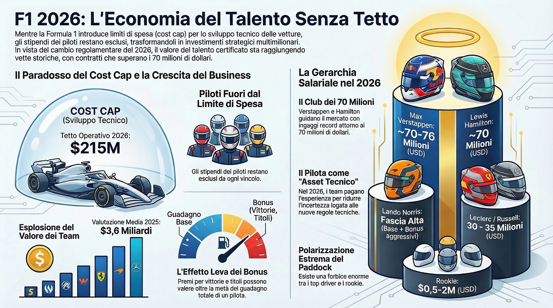 Nel paddock della Formula 1, tra le hospitality tirate a lucido e l'eco dei motori ibridi, si sta consumando una rivoluzione silenziosa ma dai numeri assordanti. Mentre gli ingegneri impazziscono per limare pochi grammi e centesimi dal telaio delle vetture, i manager staccano assegni faraonici per assicurarsi i migliori talenti al volante. È il paradosso perfetto della F1 moderna: un ecosistema dove vige un rigido "cost cap" per la progettazione e la gestione operativa delle monoposto, ma in cui gli stipendi dei piloti volano liberi da ogni limite.