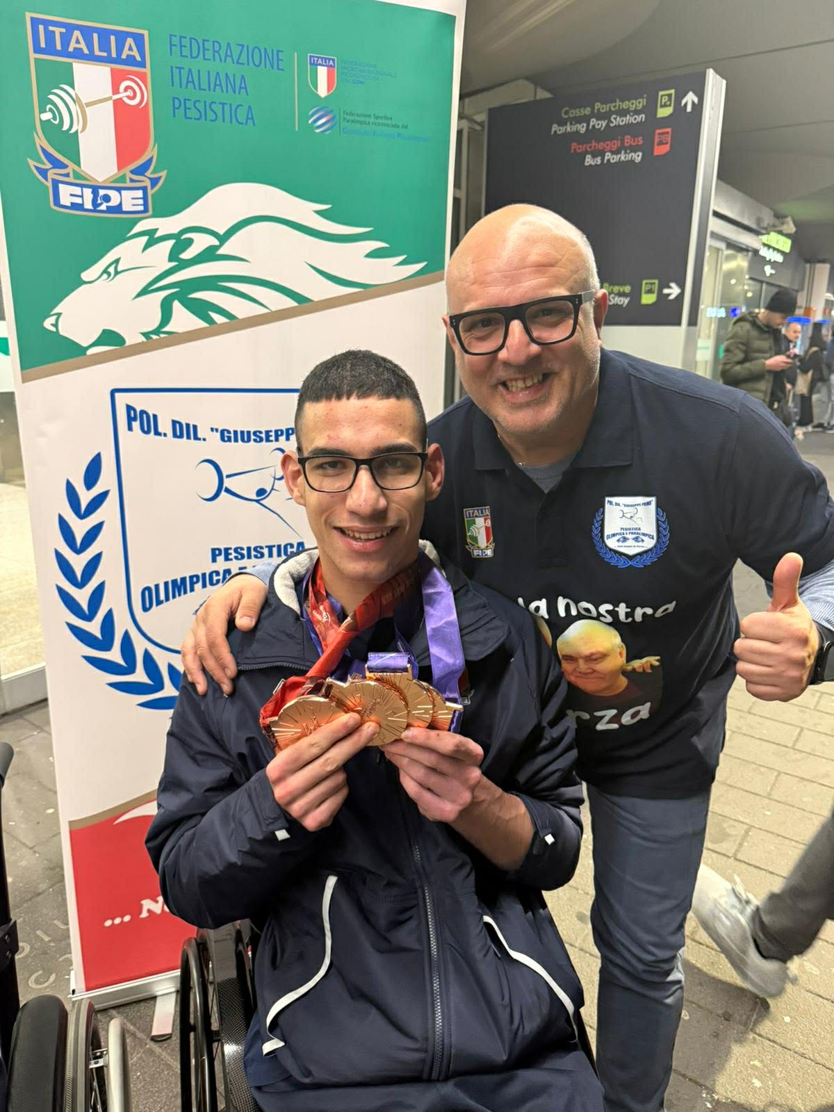 Pesi: accoglienza trionfale all'aeroporto di Catania per Nicolò Agrò dopo la conquista del bronzo agli Europei paralimpici