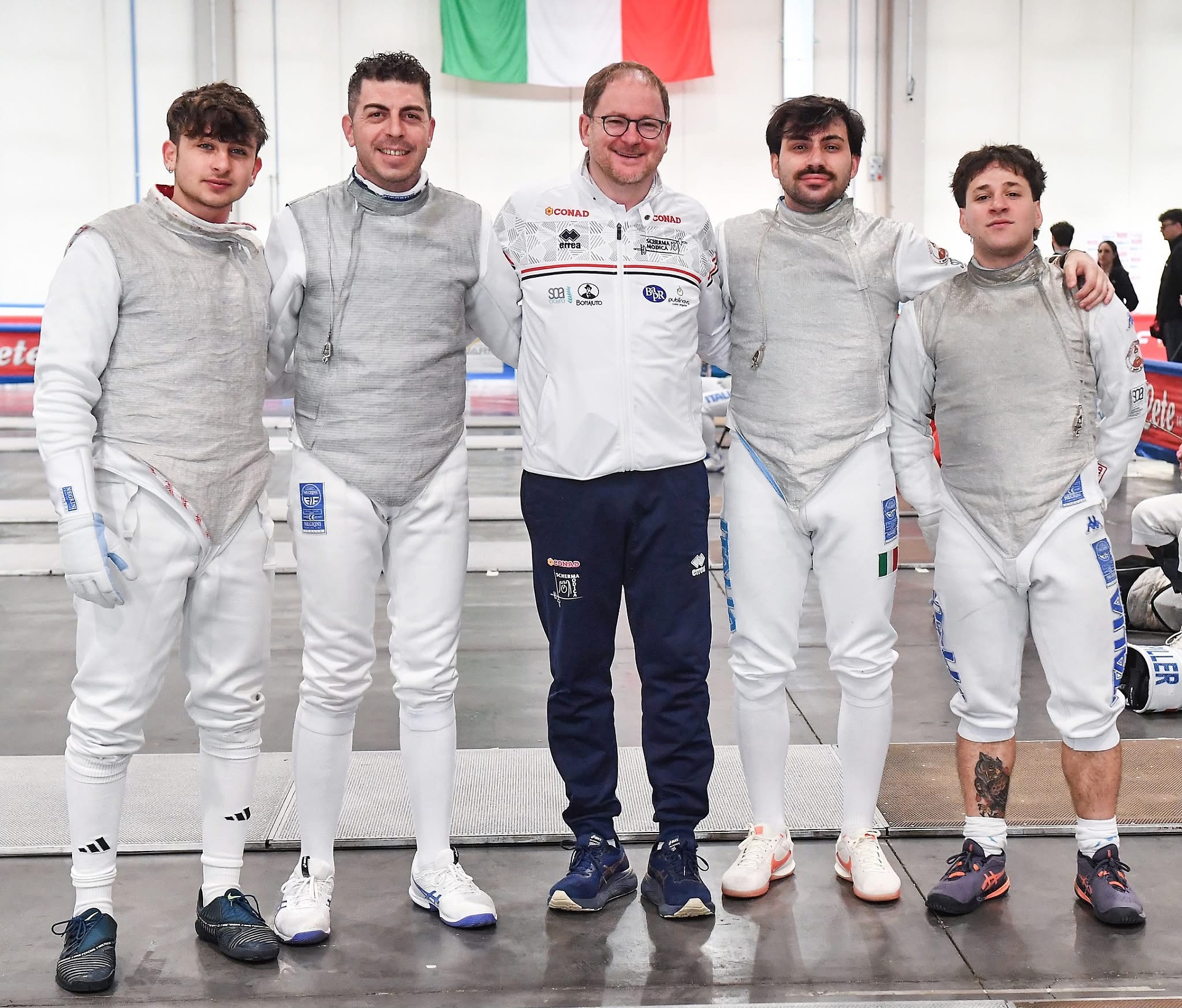 Il Catania Fencing Club promosso in Serie B1: Stefano Paradiso, Enrico Spadaro, il maestro Michele Partanni e Mattia Leonardo