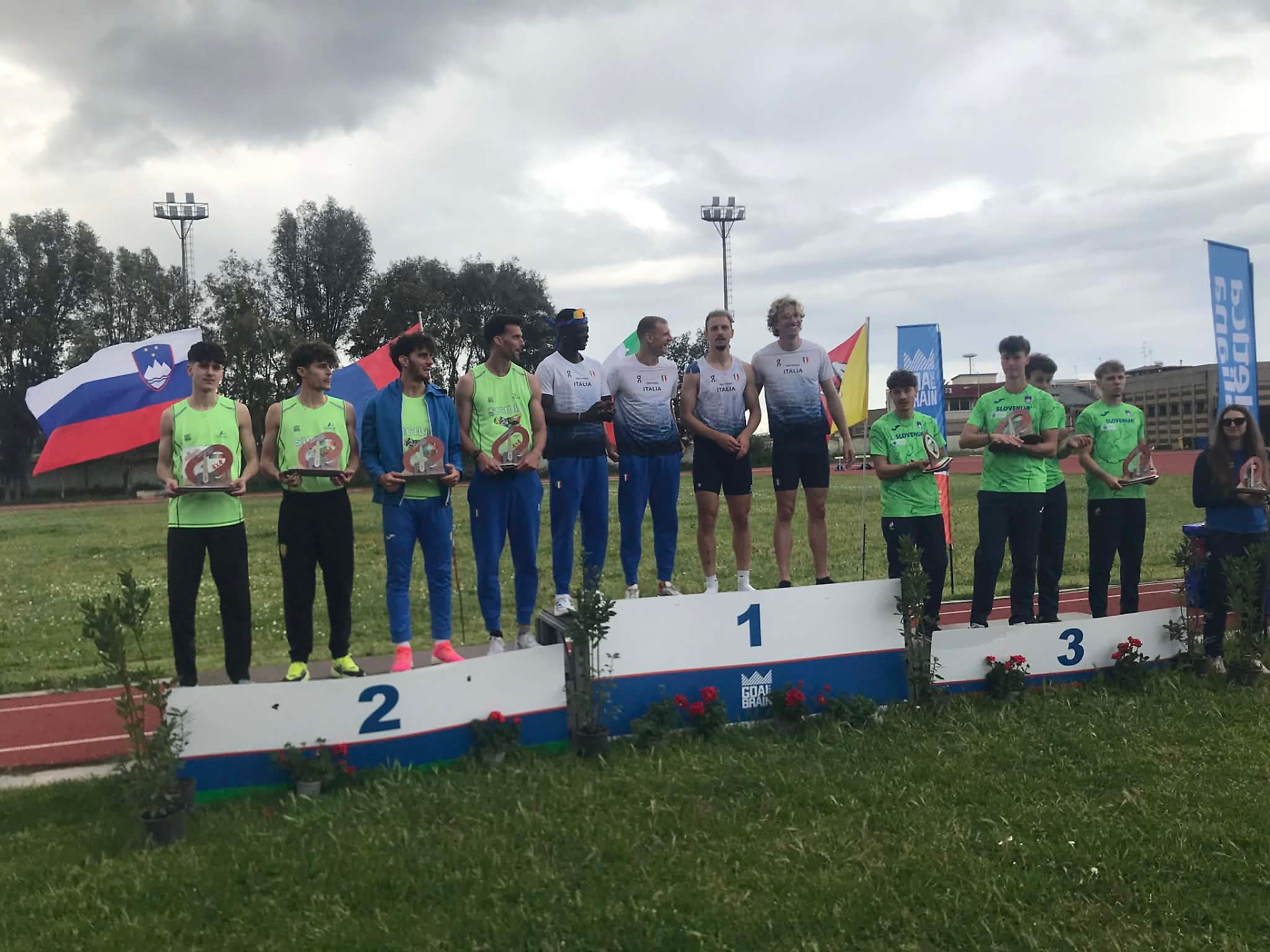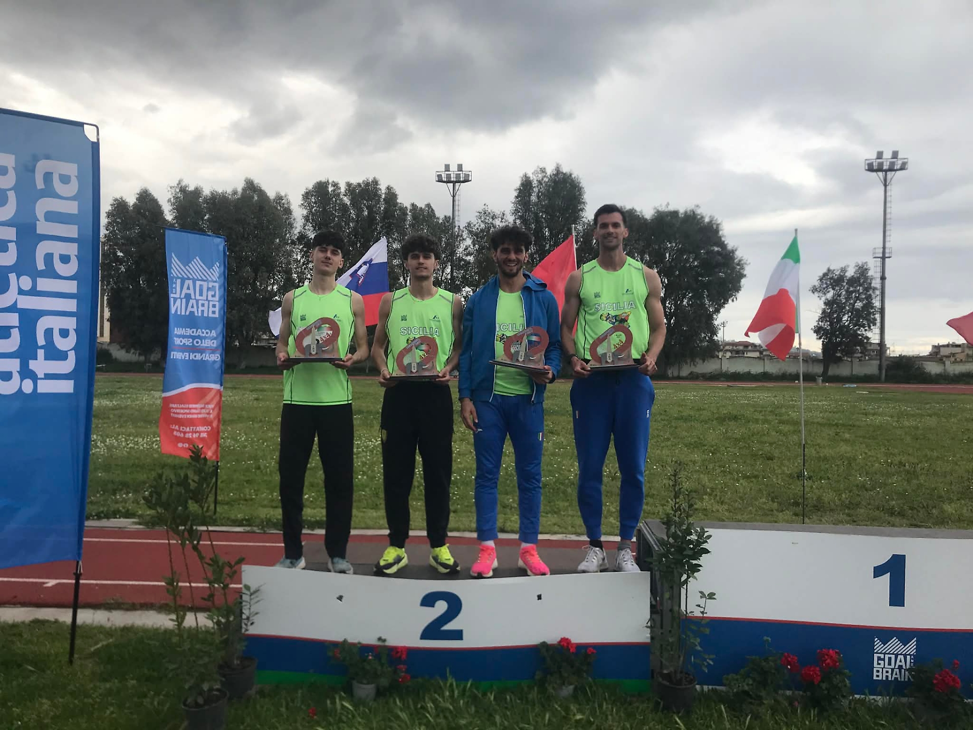 Il podio della 4x400 internazionale Italia B (2), Italia (1) e Slovenia (3)