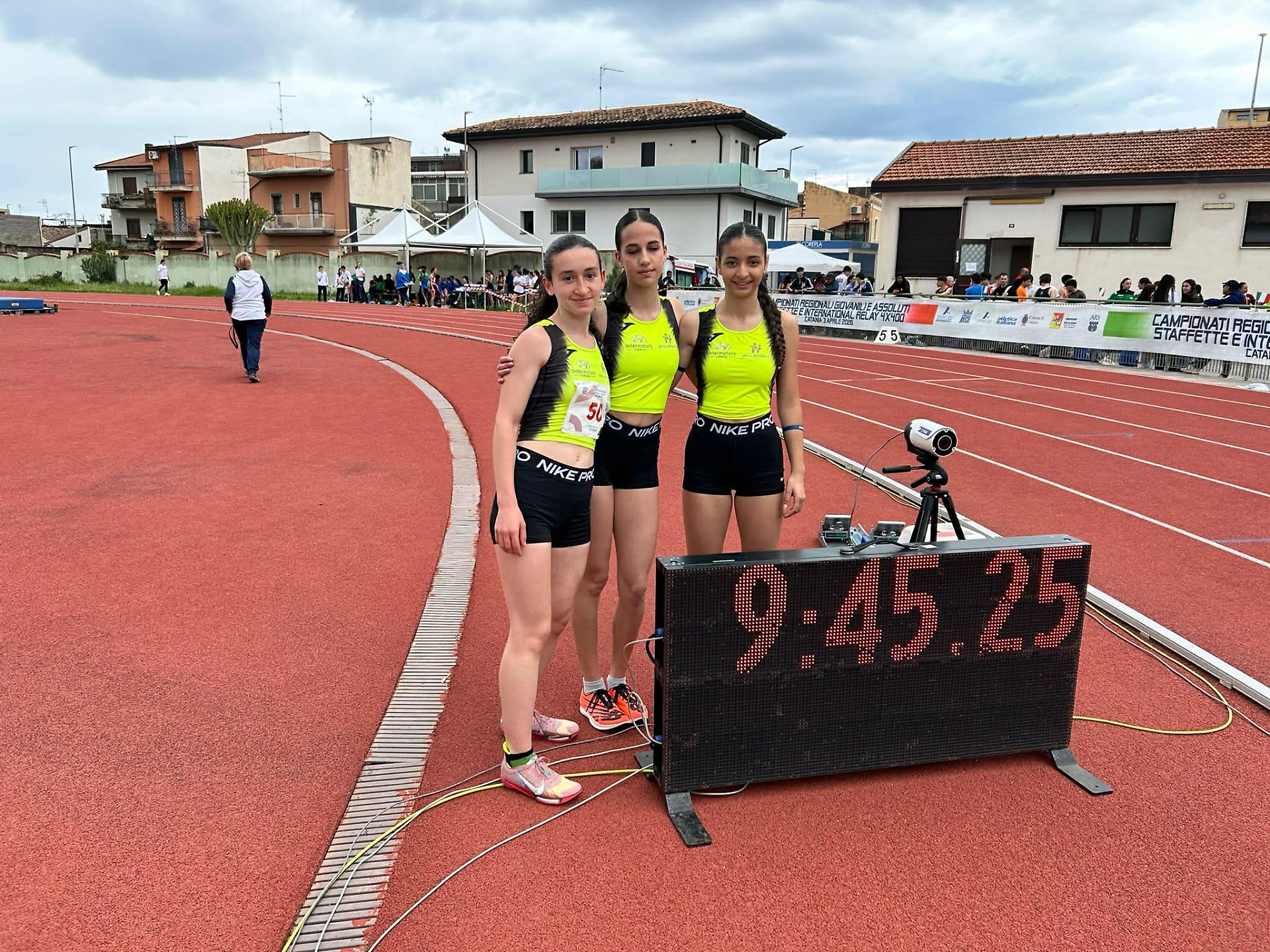 Il terzetto dell'Altis Athletics campione regionale della 3x1000 col nuovo record regionale: Viola Albo, Maia Pennisi e Alessia Santonocito