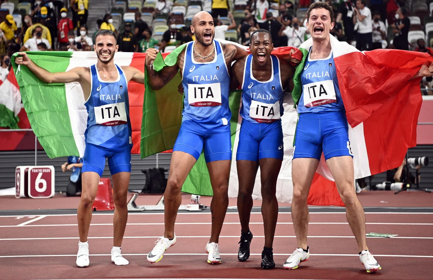 Lorenzo Patta, Marcell Jacobs, Fausto Desalu e Filippo Tortu in trionfo con la 4x100 ai Giochi di Tokyo 2021