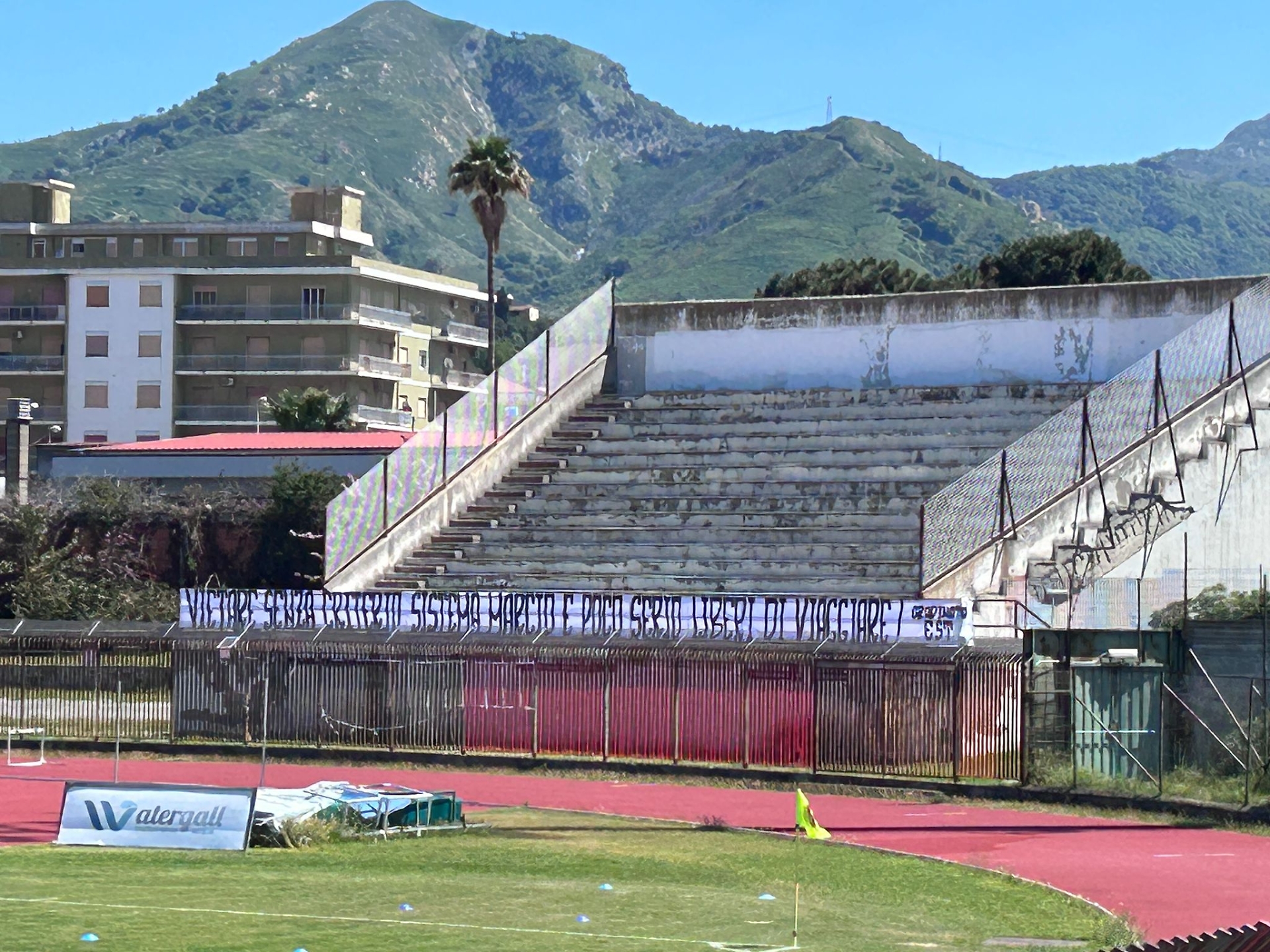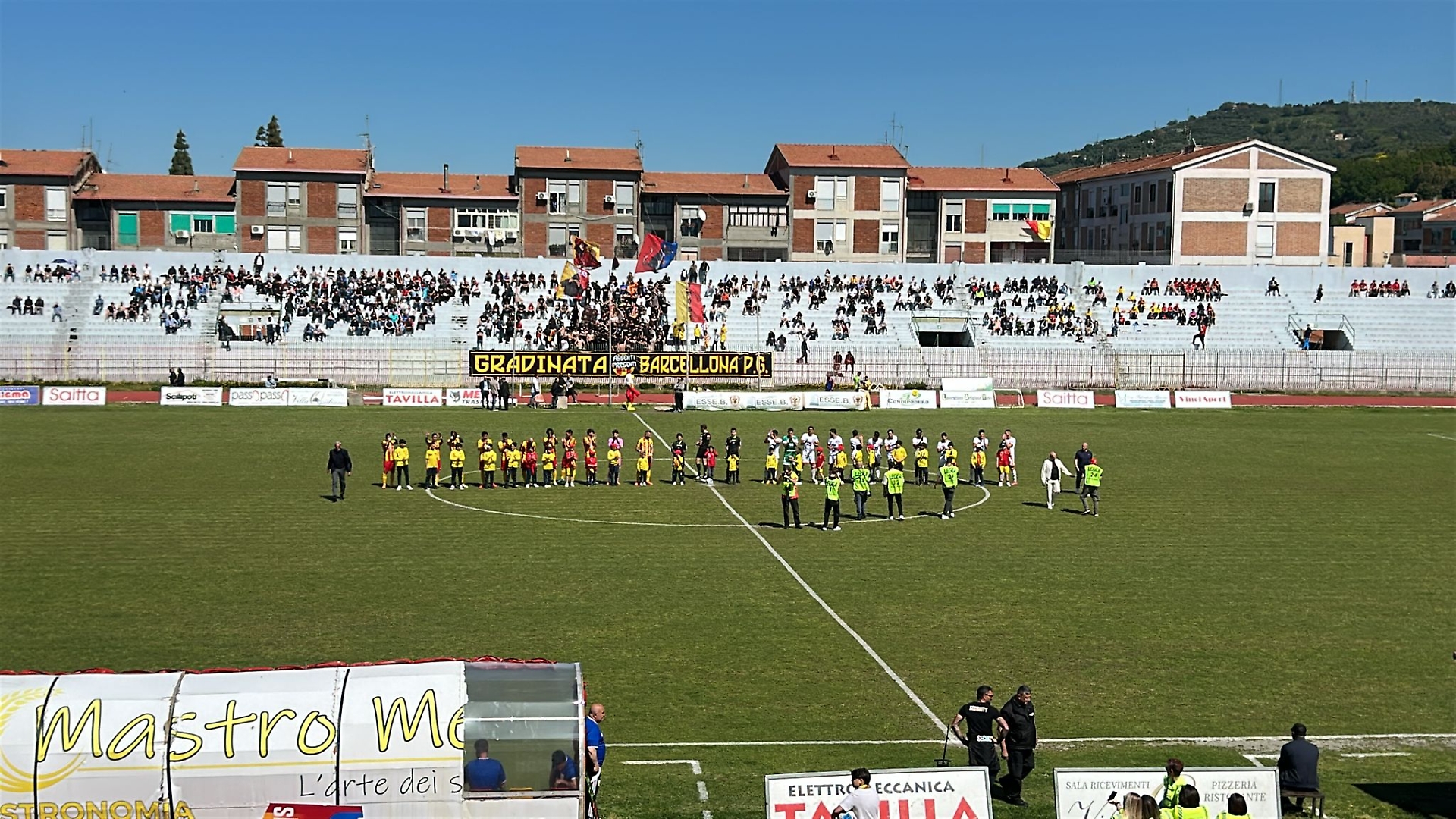 È una giornata calda, primaverile. Preannunciata una buona cornice di pubblico ma non ci sono i tifosi del Messina per il divieto da parte della questura. Nel settore ospiti vuoto uno striscione contro il divieto delle trasferte.