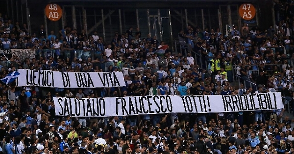 ROMA, 21 MAG - E' successo ciò che per qualcuno a Roma era impensabile, ed è un esempio di sportività dato da chi ha avuto l'idea. Durante il match dell'Olimpico contro l'Inter, i tifosi della Lazio hanno infatti reso omaggio con uno striscione al capitano dei cugini che per un quarto di secolo ha cercato di rendere dura la vita al club biancoceleste. "I nemici di una vita salutano Francesco Totti", era scritto sullo striscione apparso in Curva Nord al 30' di Lazio-Inter e firmato 'Gli Irriducibili', gruppo storico del tifo laziale.