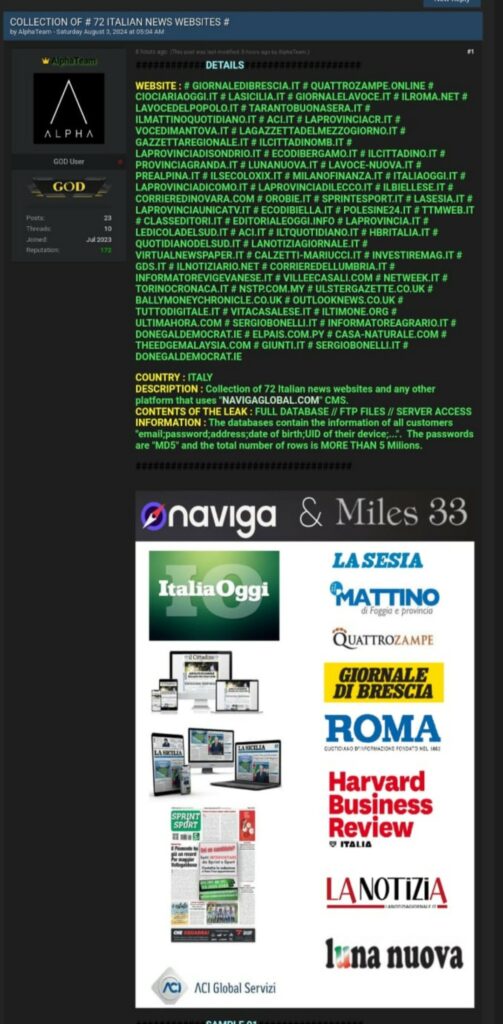 Alpha Team ha dichiarato di avere a disposizione i dati di 77 aziende italiane, tra i quali email, password e altri dati personali. A dimostrazione di ciò i pirati informatici oggi hanno inviato notifiche push ed e-mail ai nostri abbonati per informarli di aver in mano i dati sensibili: i cybercrimiali - che minacciano di diffondere i dati di cui sono in possesso e accusano la nostra azienda di non avere a cuore la privacy degli abbonati - hanno chiesto un riscatto per liberare la "galassia" di siti che fanno riferimento a Miles33. ma in realtà la sicurezza degli utenti è una priorità per La Sicilia. E oggi abbiamo presentato anche una denuncia alla polizia postale che ha già avviato le indagini. Gli utenti sono pregati di non cliccare sui link inviati per non correre rischi.