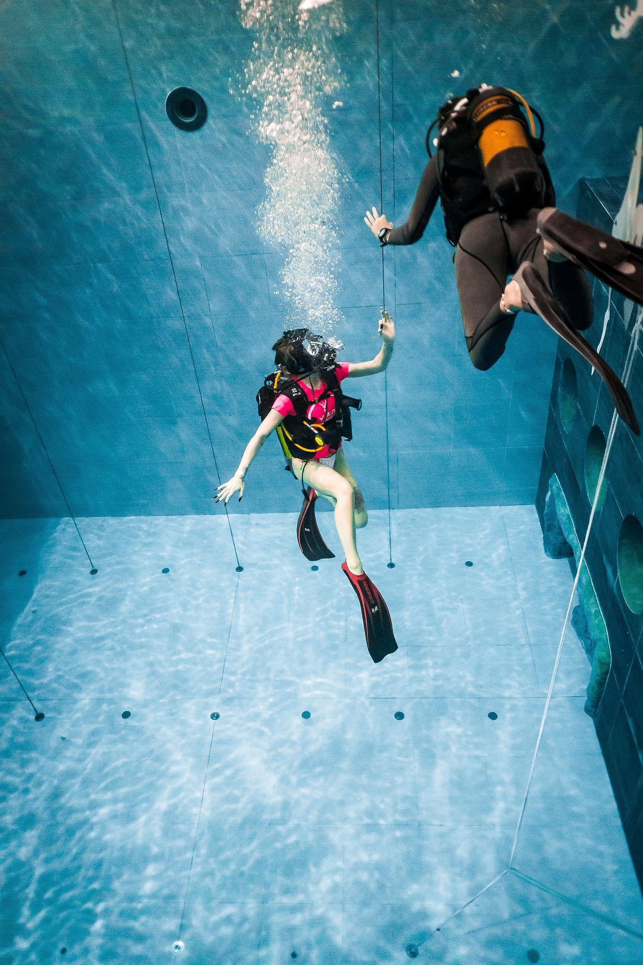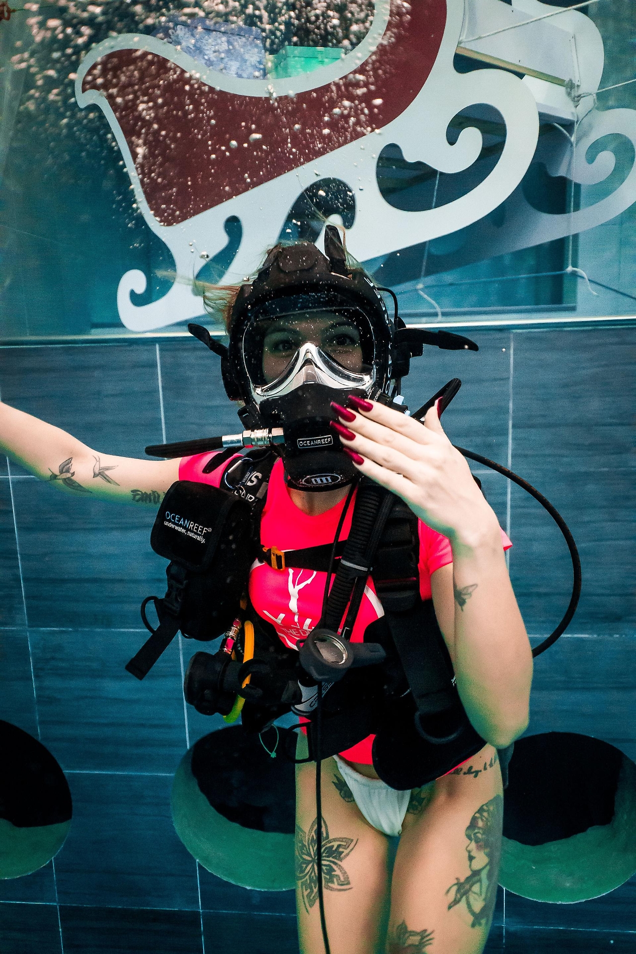 La vocalist, già modella e Miss Veneto 2020, è potuta scendere con l’istruttrice di subacquea di Y-40 Giada Scarpa fino ai -12 metri, la massima profondità per chi non ha ancora conseguito un brevetto. Si è divertita in sicurezza nei grandi spazi della struttura e intorno al ponte sommerso a -5 metri da dove la osservavano alcuni spettatori incuriositi, tra cui il dj Marco Cavax.