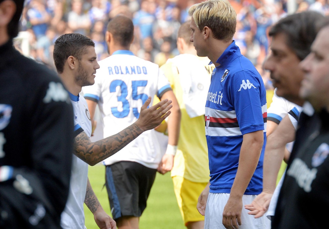 Se c’è un fotogramma che ha scolpito questa storia nell’immaginario collettivo è il 13 aprile 2014 allo stadio Ferraris: Sampdoria–Inter. Le telecamere inseguono il pre-partita, arriva la fila delle strette di mano e Maxi López allunga il braccio, poi lo ritrae quando tocca a Mauro Icardi. Quel rifiuto è più eloquente di qualunque titolo: il “Wanda derby” entra nella lessico sportivo, con tutti i sentimenti ingombranti che trascina — fischi, esultanze, un rigore sbagliato — e segna il passaggio definitivo del privato sul palcoscenico pubblico. Il resto è noto: poco più di un mese dopo, il 27 maggio 2014, Wanda Nara e Mauro Icardi si sposano con una cerimonia civile a San Isidro (provincia di Buenos Aires), davanti a soli 12 invitati; il 7 giugno la grande festa suggella l’evento.