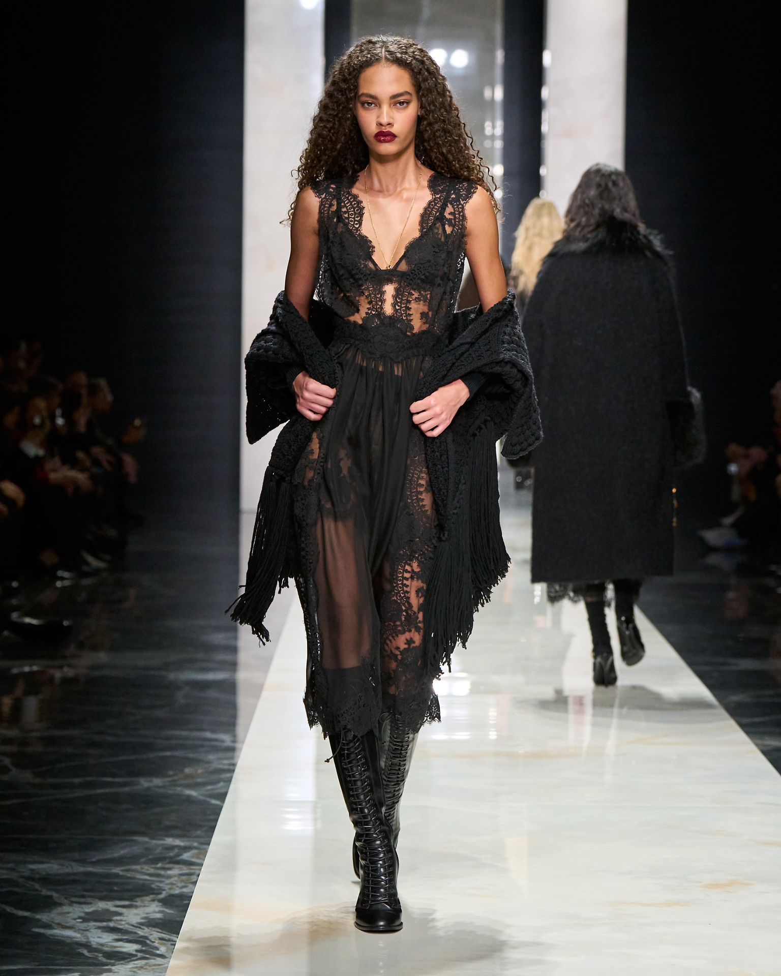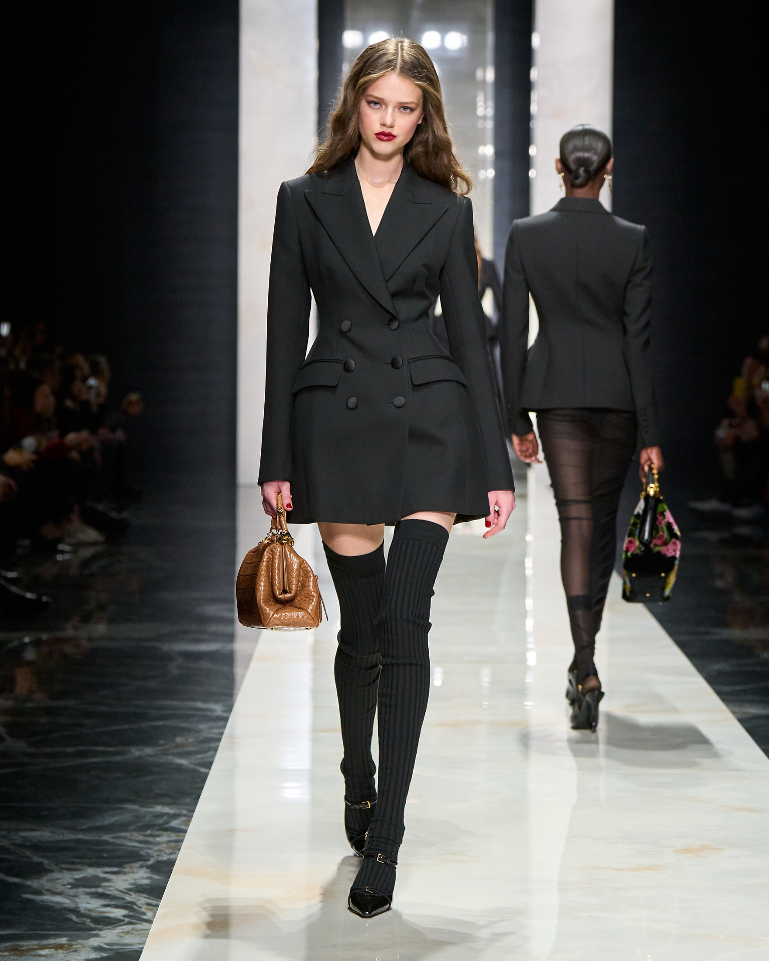 In passerella il Dna della maison incanta: c’è l’iconico tubino nero che fasciava il corpo della stupenda “Malèna” di Tornatore, un tripudio di pizzo, quello della tradizione artigianale siciliana, che lascia intravedere un intimo fatto di guêpière, brassiere, culotte e parigine, che completano anche lo strepitoso look con l’elegante rivisitazione della Bar jacket, coperto, talvolta, dai tradizionali scialli tricot. In dialogo con questo trionfo di femminilità ci sono i suit presi in prestito dal guardaroba maschile come anche la coppola.