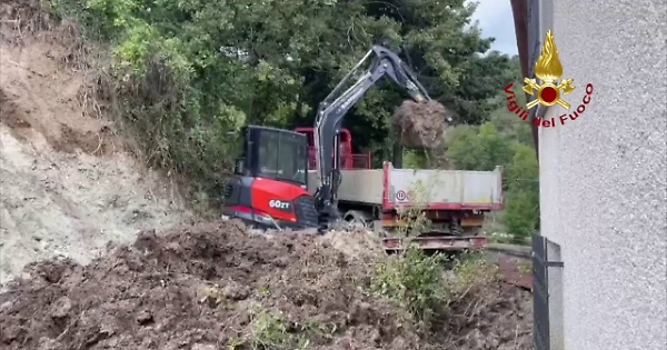 Nelle Marche prosegue il lavoro delle squadre dei Vigili del Fuoco per liberare le strade ostruite da detriti e fango nelle zone colpite dall'alluvione. Gli escavatori sono al lavoro nella frazione Palazzo, comune di Arcevi. tvi/gsl
