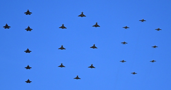 Il primo passaggio dei velivoli dell’Aeronautica Militare sul cielo del Pincio disegna un 100 inviolato dalle nuvole, scomparse dopo un lunedì di pioggia e grandine per lasciare ai festeggiamenti della forza armata azzurra il giusto palcoscenico.