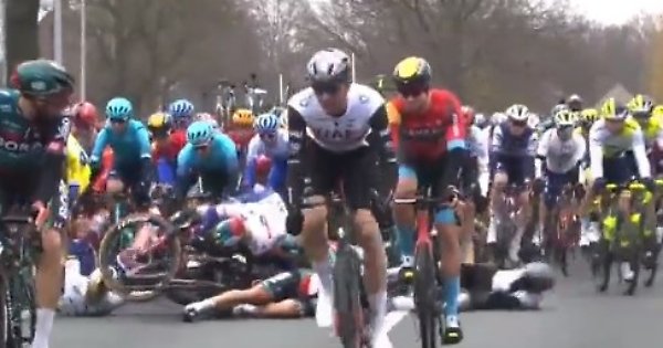 Al Fiandre la follia di Maciejuk che fa cadere 40 corridori: il video
