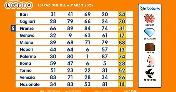 Ecco le estrazioni del Lotto di oggi 6 marzo 2025: