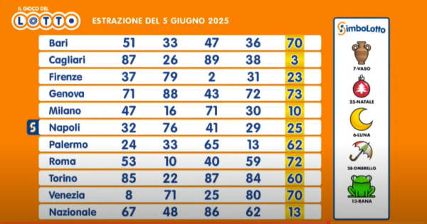 Ecco le estrazioni del Lotto di oggi 5 giugno 2025.