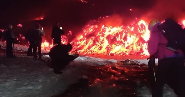 Tanta neve sull'Etna. E la colata lavica originata l'8 febbraio a quota 3000 metri da una fessura eruttiva alla base meridionale del cratere “Bocca Nuova”, e che sta scendendo lentamente con discreta alimentazione fino a raggiungere quota 1900 metri circa continua a dare spettacolo. Tra le tante foto e video, Gianluca Musmeci ha catturato ieri 14 febbraio le immagini di un fenomeno unico: un vero e proprio corso d'acqua generato dal contatto tra la lava incandescente e la neve.