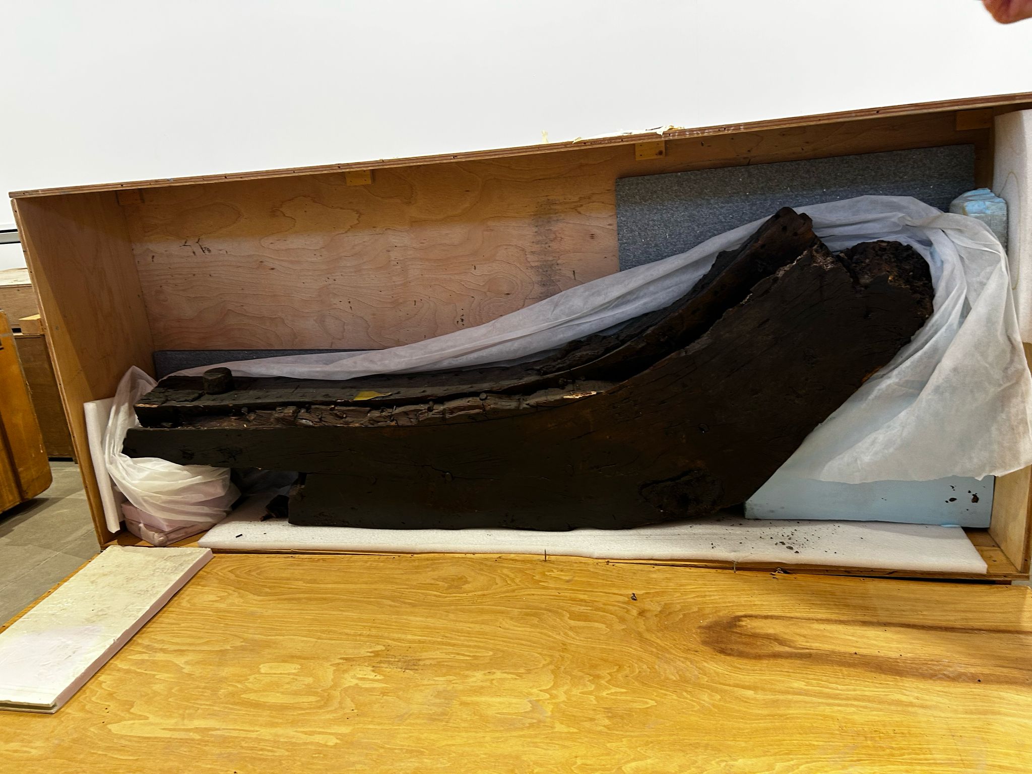 In due casse - ma ce ne sono tante altre - gli elementi lignei della nave greca arcaica, recuperata nelle acque antistanti contrada Bulala