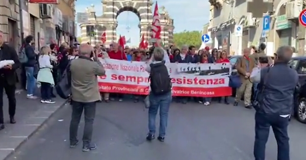 Ecco la partenza del corteo del 25 aprile a Catania da piazza Palestro. Poco dopo l'avvio i partecipanti hanno intonato la canzone Bella Ciao, simbolo della Resistenza dei partigiani. Il corteo ha al centro i valori portanti della nostra Repubblica: l’antifascismo, la tutela di tutti i diritti sociali e civili, l’indivisibilità della Repubblica, minacciata dall’autonomia differenziata, l’uguaglianza dei diritti, i valori dell’accoglienza, il ripudio di tutte le guerre, alimentate dall'invio delle armi, e la centralità della pace.