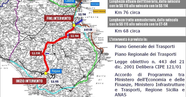 Dopo anni di promesse, gare d'appalto bandite e bloccate, tira e molla istituzionali, i lavori del nuovo itinerario del collegamento stradale Ragusa-Catania sono stato presentati, nel PalaRegione di Catania alla presenza, tra gli altri, del ministro delle Infrastrutture, Matteo Salvini, il presidente della Regione Siciliana, Renato Schifani, e il presidente Edoardo Valente e l’amministratore delegato di Anas, Aldo Isi.