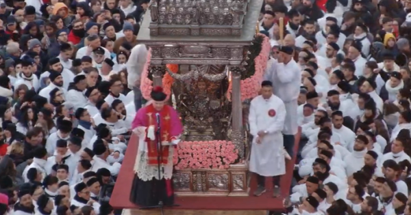 Sant'Agata è tra la sua gente. Dopo la Messa dell'Aurora, presieduta alle 6 di stamane dall'arcivescovo di Catania, monsignor Luigi Renna, il busto reliquario della Patrona di Catania ha attraversato, tra i tantissimi devoti presenti, la navata della Cattedrale per uscire fuori, in piazza Duomo, ed essere posto sul fercolo. Comincia così il giro esterno lungo le vecchie mura della città nella seconda giornata della Festa. Il messaggio del parroco della Cattedrale, monsignor Barbaro Scionti ha dato il via alla processione
