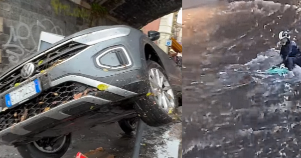 Altra situazione critica in zona Pescheria dove il maltempo ha messo sottosopra banchi del pesce, ombrelloni e persino un'auto. Il mezzo è stato infatti trovato, e filmato, sollevato da terra e quasi infilzato, al centro, da uno dei paletti installati per delimitare gli Archi della Marina. Sarebbe stata la forza dello scorrere della pioggia a spostare l'auto, parcheggiata lì vicino, fino a sotto gli Archi danneggiandola poi in quel modo.