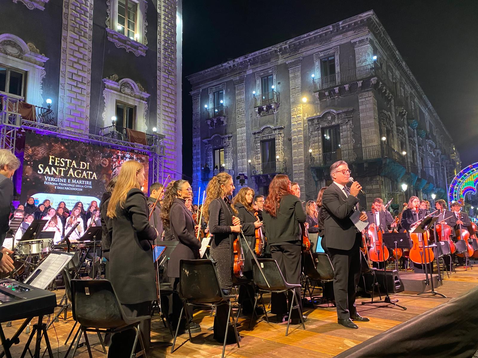 Sul palco anche i 55 bambini delle scuole a indirizzo musicale componenti del coro di voci bianche “Fanciulli di Agata” che hanno eseguito con emozione e maestria, nonostante la loro giovane età, gli inni in onore di Sant’Agata. Maestro concertatore e direttore d’orchestra Giuseppe Romeo, mentre Francesco Costa è stato maestro del coro. La serata è stata condotta da Ruggero Sardo.