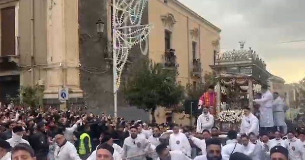 Ecco il video dell'«acchianata» di Sangiuliano uno dei momenti clou della processione per Sant'Agata a Catania. Il fercolo trainato dai devoti affronta la ripida salita di via di Sangiuliano nel centro storico della città circondati da ali di fedeli e sotto una leggera pioggerellina. (video di Carmelo Aurite)
