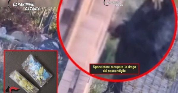 Grazie al monitoraggio col drone è stat rinvenuto anche il nascondiglio in una zona periferica di Santa Maria di Licodia, precisamente in Strada Bordonaro, di due involucri con circa 350 grammi di marijuana.