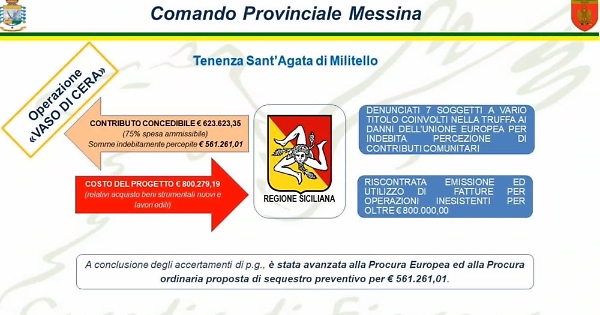 Il provvedimento è arrivato al termine di un’articolata attività d’indagine nei confronti di una società operante nel Comune di Reitano (ME), beneficiaria di ingenti fondi strutturali illegittimi, ammontanti a circa 560 mila euro.
