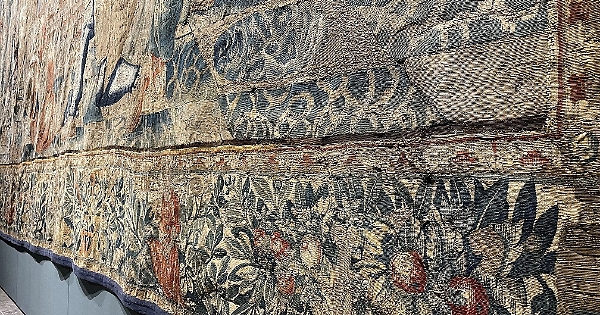 E’ una storia bella: per gli arazzi della Cappella Sistina Raffaello realizzò su incarico di papa Leone X, la serie di dieci cartoni (sette sono esposti al Victoria & Albert Museum di Londra); e da quel grande comunicatore quale era, sapeva perfettamente che la copia è l'anima della conoscenza. L’opera raffigura la morte di Anania, fulminato da san Pietro perché colpevole di non aver consegnato alla comunità cristiana tutto il denaro ricavato dalla vendita di un fondo. La scena fu costruita per un insieme di dieci arazzi dedicati all'opera evangelizzatrice dei santi Pietro e Paolo, dai quali vennero tratti i cartoni che servirono al primo arazziere Pieter Van Aelst per la tessitura. Gli arazzi furono sin da subito celebri e alcune corti d'Europa chiesero di replicarli affidandoli ad artigiani francesi, belga e tedeschi. Questo in esposizione fu realizzato a inizio ‘600 dall’arazziere Heinrich Mattens ‒ del quale si conservano alcuni esemplari nella Cattedrale di Tolosa ‒ e presenta, rispetto ai cartoni di Raffaello, alcune modifiche negli sfondi e una ricca bordura con festoni vegetali in cui sono racchiuse varie figure allegoriche.