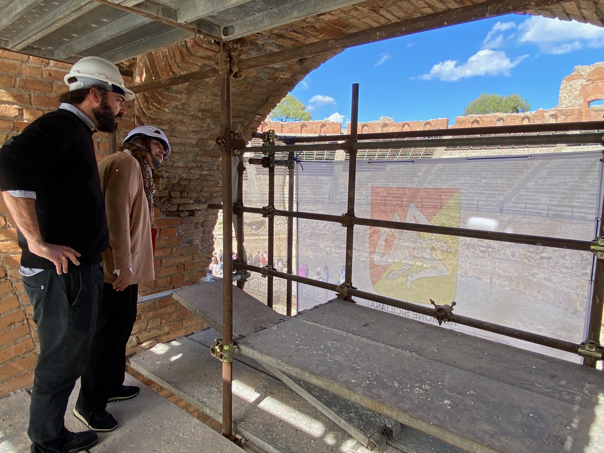 Hanno preso il via al Teatro Antico di Taormina i lavori di restauro conservativo del “porticus post scaenam”, il retro della scena che si apre a sud sul grandioso paesaggio dell’Etna e del mare. Un intervento voluto e programmato dal Parco archeologico Naxos Taormina, diretto dall’archeologa Gabriella Tigano, che segue a distanza di circa settant’anni lo storico restauro del grande archeologo Luigi Bernabò Brea, al quale si deve l’attuale configurazione del complesso monumentale con cui da allora (1958-59) è conosciuto in tutto il mondo.