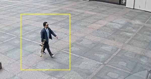 Come mostrato dalle immagini della CNN, un uomo con occhiali da sole, scarpe da ginnastica, pantaloni neri, giacca blu e camicia azzurro chiaro si è avvicinato camminando tranquillamente all’ingresso.