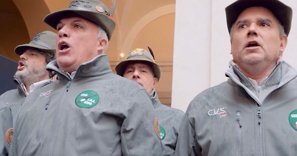 A Palazzo Chigi gli alpini cantano l'inno nazionale. E anche Meloni, nel finale, non rinuncia al "sì"