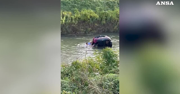 Finisce con l'auto nel fiume, due si tuffano per salvarlo: il video del recupero