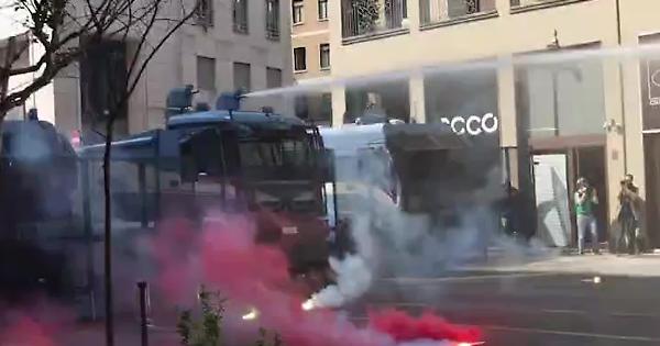 In via Borgogna le forze dell'ordine stanno usando idranti contro i manifestanti, mentre gli antagonisti lanciano petardi, fumogeni, bottiglie contro gli agenti, nel tentativo di forzare il blocco e arrivare in piazza Duomo.