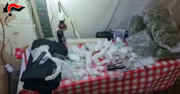 Nell'abitazione di un 42enne a San Cristoforo, in via Pietro Platania, i carabinieri hanno sequestrato una pistola semiautomatica calibro 22 con la matricola cancellata corredata da un silenziatore, un giubbotto antiproiettile e 313 proiettili di vario calibro, 37 involucri contenenti varie pietre di cocaina e 69 dosi già confezionate della stessa sostanza stupefacente per un peso complessivo di 1 chilo e 343 grammi. Inoltre sequestrati 55 grammi di crack in pietra, 91 grammi di hashish, 8 involucri per 1,789 kg di marijuana, e 28 "pizzini" con nomi ed importi riferibili alla vendita ed agli acquirenti delle sostanze stupefacenti.