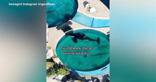 Un timelapse di 24 ore, filmato dal gruppo UrgentSeas il 12 agosto, mostra un'orca assassina in cattività che giace quasi immobile mentre fissa il cancello del suo recinto, come se chiedesse di essere lasciato uscire. Kshamenk, un'orca di 35 anni, è tenuta in una piccola piscina al Mundo Marino, il più grande acquario dell'Argentina. "Vive in questa vasca di cemento dal 1992. Non vede un'altra orca dal 2000, quando il suo ultimo compagno di acquario è morto. Le orche sono animali sociali e soffrono quando non sono in compagnia di loro simili", si legge nel video. (NPK) (Fonte: immagini Instagram UrgentSeas)