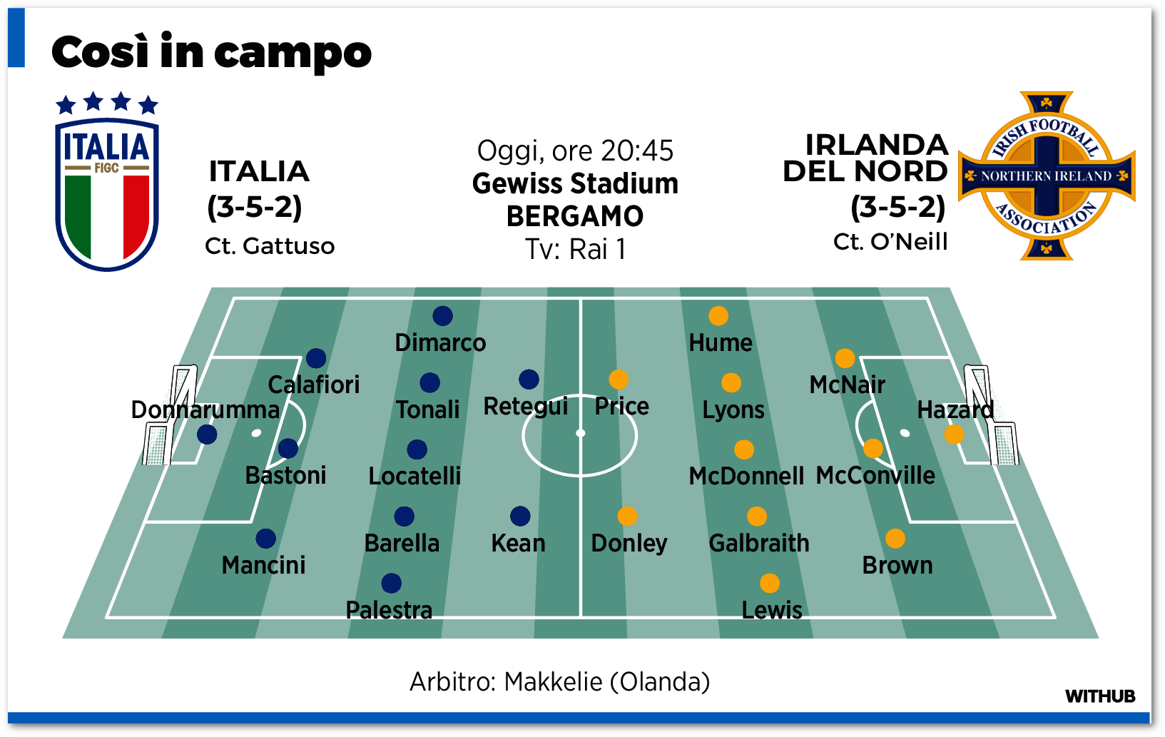 La nazionale del cinquantaiseienne Michael O’Neill è maestra, da sempre, nel “kick and rush”: lancio lungo e attacco alle seconde palle. Come ha ribadito Gattuso, gli Azzurri dovranno essere bravi ad annusare il pericolo. Sarà importante non commettere falli ingenui, per non dar modo agli avversari di sfruttare i palloni alti. “Loro sistematicamente buttano la palla “in the box”, ha proseguito il Ct azzurro, su qualsiasi fallo commetti il portiere fa un lancio di 70/80 metri con 8/9 giocatori con una fame incredibile pronti a colpire la palla. Vanno a nozze sulle seconde palle. È una squadra verticale, che tutto quello che fa lo fa in maniera egregia. Dovremo farci trovare pronti, stare sul pezzo per novanta minuti sapendo che non esistono più partite facili”.