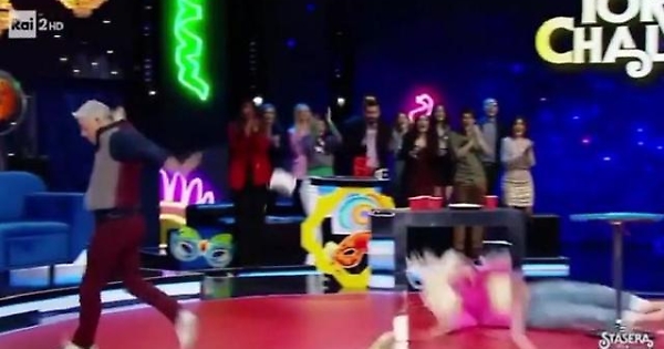 Torta in faccia e caduta per l’imitatore Vincenzo De Lucia, il video dello scivolone. L’episosio a «Stasera tutto è possibile»