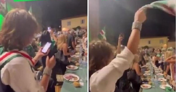 Gianna Nannini sventola il fazzoletto verde alla cena della Contrada dell’Oca per il Palio di Siena. Nel video pubblicato dall’artista su Instagram si sentono i sostenitori intonare l’inno della contrada.