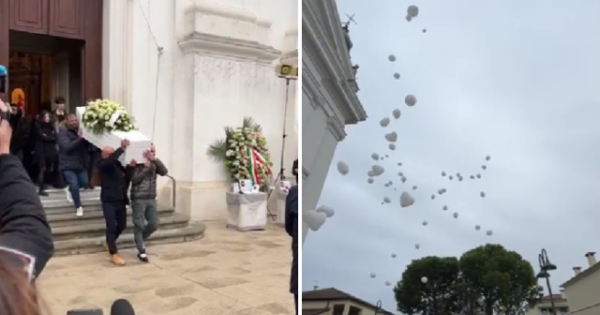 L'uscita della bara di Giulia dalla chiesa di Saonara, tra applausi e palloncini bianchi