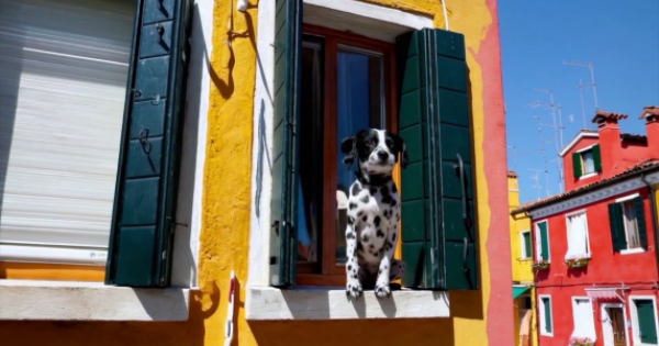 - La telecamera è rivolta direttamente verso gli edifici colorati di Burano. Un adorabile dalmata guarda attraverso una finestra di un edificio al piano terra. Molte persone camminano e vanno in bicicletta lungo le strade del canale di fronte agli edifici.