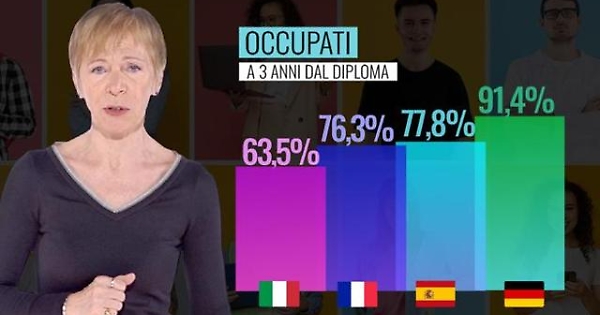 Il passaggio dall’istruzione al lavoro è altrettanto problematico. I ragazzi nel corso degli anni della formazione hanno poche occasioni di incontro con le imprese per orientarsi verso le future occupazioni. Risultato: i diplomati italiani che hanno trovato lavoro a tre anni dal conseguimento del titolo di studio sono solo il 63,5% contro il 76,3% dei francesi, il 77,8% degli spagnoli e il 91,4% dei tedeschi. Per i laureati la situazione migliora, ma di poco: hanno un lavoro, a tre anni dal titolo, quasi tre su quattro (74,6%) contro l’83,1% degli spagnoli, l’83,4% dei francesi e il 94,4% dei tedeschi.