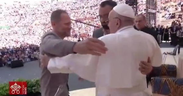 Durante la visita a Verona di papa Francesco, sul palco dell’Arena sono saliti Maoz e Aziz, due imprenditori provenienti rispettivamente da Israele e Palestina che hanno perso dei familiari a causa del conflitto. «Il dolore ci ha riavvicinati per creare un futuro migliore», hanno detto, interrotti dal pubblico dell’Arena che ha tributato loro un lungo applauso. Papa Francesco li ha definiti «fratelli» ed ha stretto entrambi in un abbraccio: «Abbracciarsi – ha detto il pontefice – è un progetto di futuro». Credit: immagini di Vatican News.