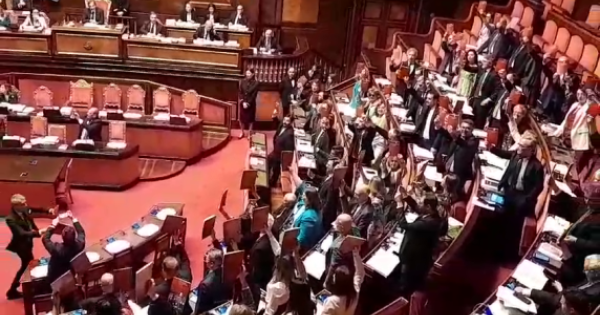 Protesta delle opposizioni nell'Aula del Senato al termine della votazione del