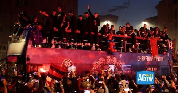 Festa in grande stile a Bologna in occasione della qualifica del Bologna Fc in Champions League. Lungo le vie della città fino a piazza Maggiore 40mila i tifosi che hanno partecipano alla parata tra fumogeni, cori e bandiere. Il pullman scoperto con i giocatori, partito dallo stadio, ha raggiunto piazza Maggiore, colma di supporter rossoblù.